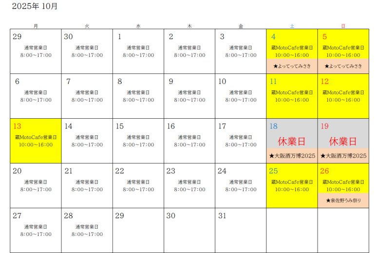 営業日のご案内2025.09.29 「10月」酒蔵売店、蔵Moto Cafe営業日のご案内 酒蔵売店は平日8時~17時まで営業中、土日祝日は以下の通りを予定しております♪ 「蔵MotoCafe」は平日休業、土日祝日は以下の通り営業致します。