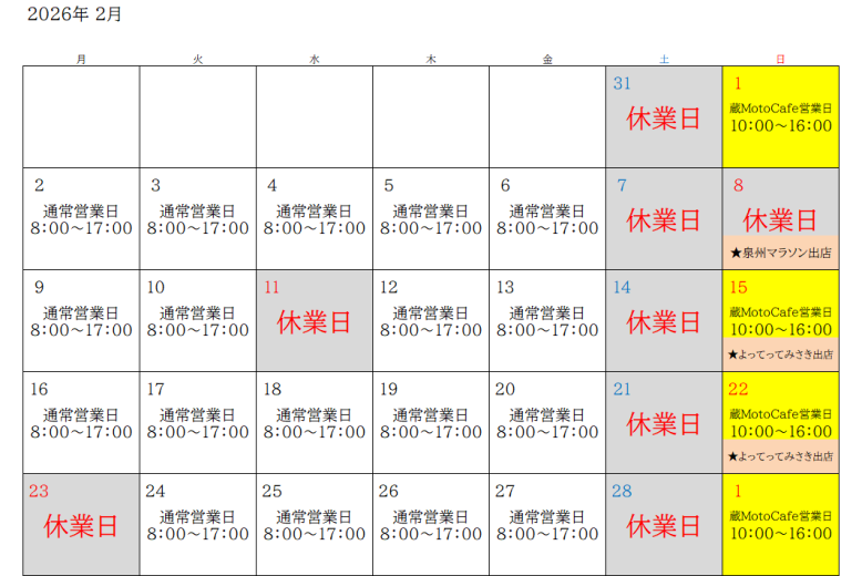 「蔵MotoCafe」は平日休業、土日祝日は以下の通り営業致します。